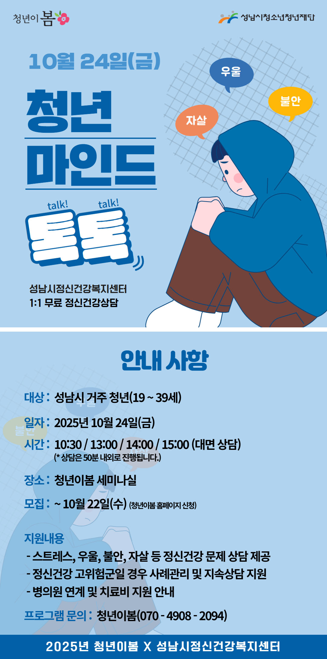 [청년이봄] 청춘상담소 10월 '청년 마인드톡톡' 참가자 모집(~10.22.)
